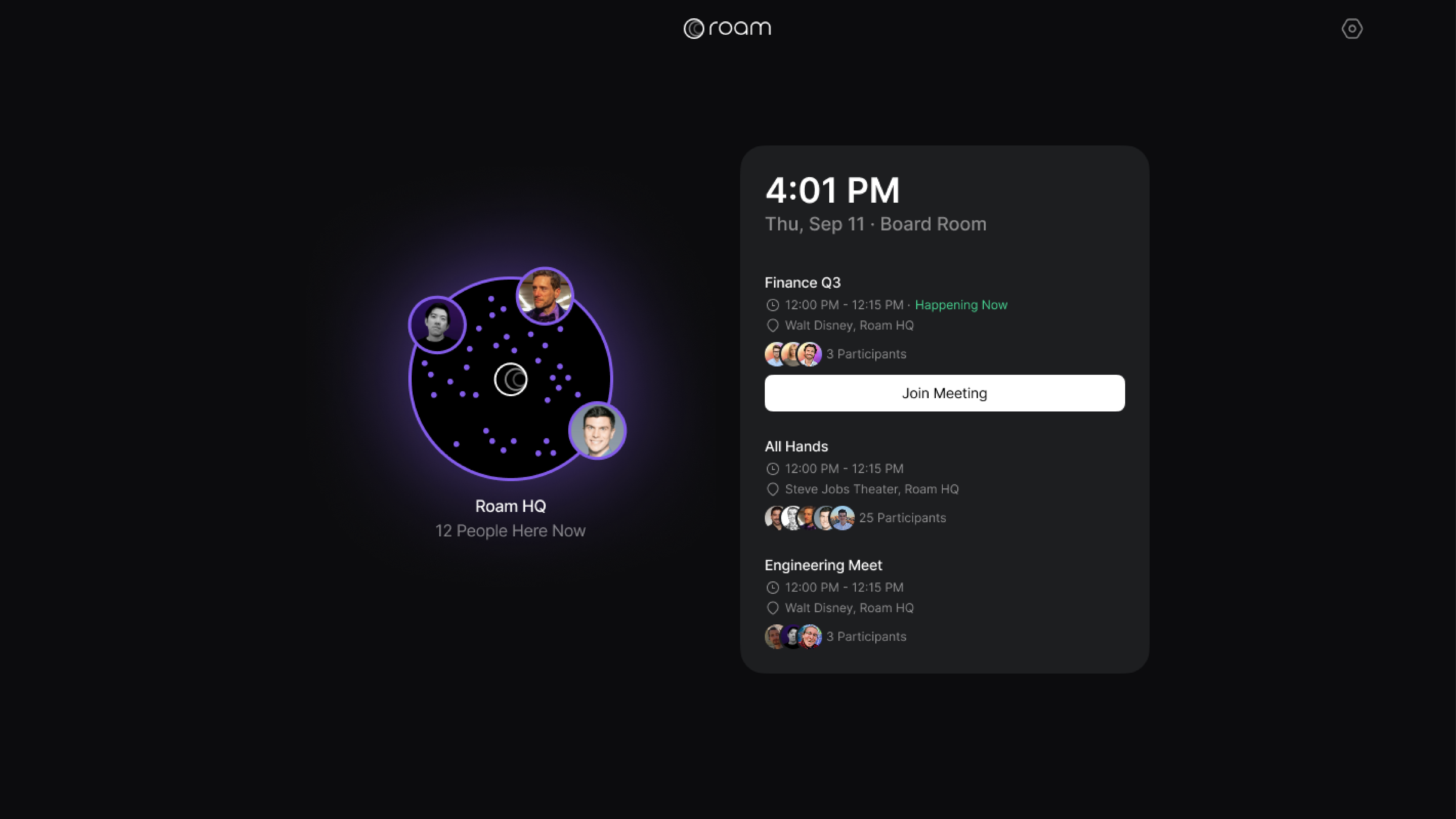 Roam supports Neat products, such as Neat Board series and Neat Bar series for use with RoamVision. This enables companies in hybrid office environments to connect their physical conference rooms to Roam, allowing multiple Roam members to join meetings directly from a Neat device in their office.