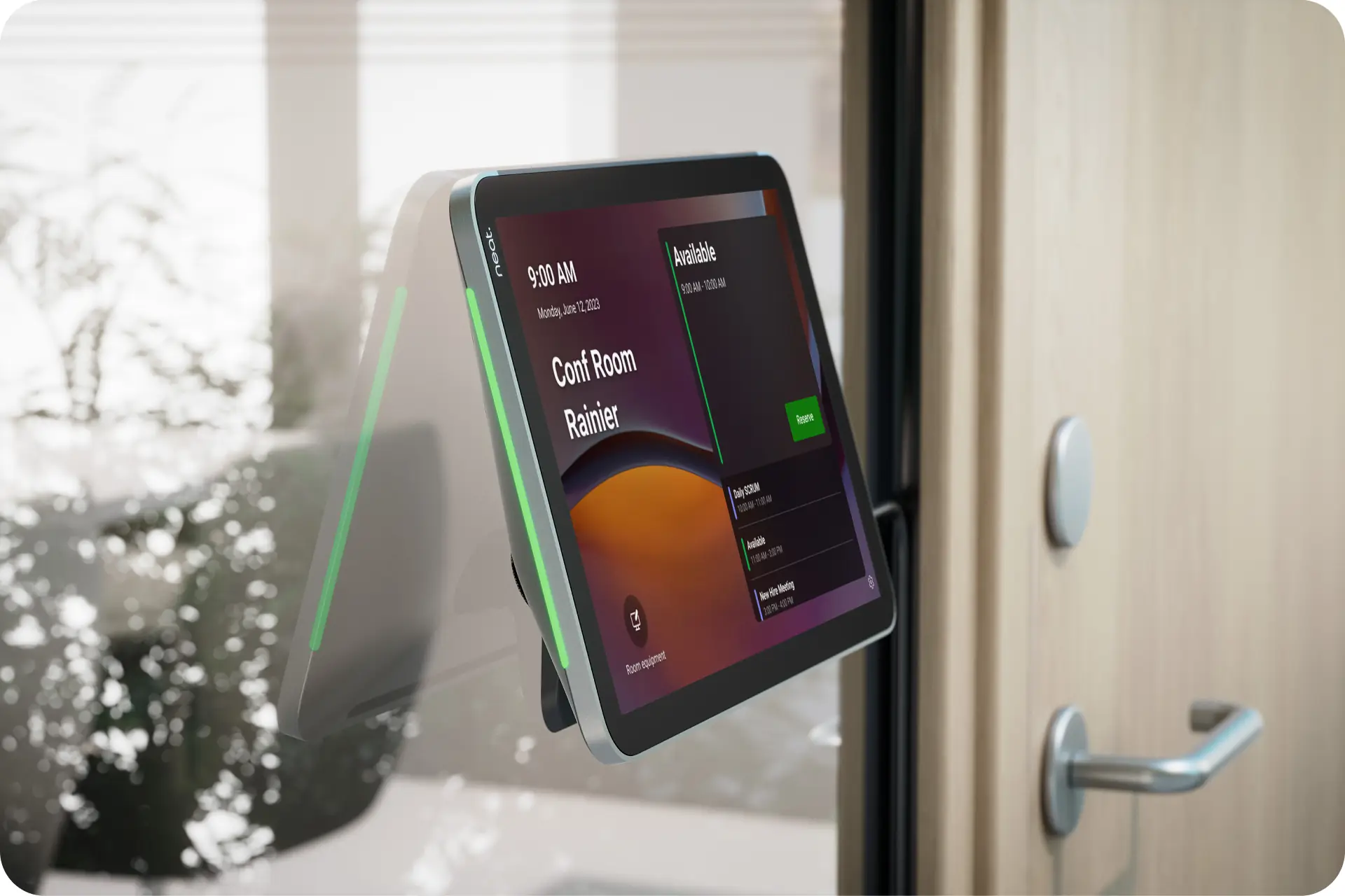 Use Neat Pad Pro inside the room as a meeting controller to start or manage meetings with a single touch, or mount it outside as a scheduling display to see room availability at a glance and book a space. The RGB light bar makes room status visible from across the hall, so everyone knows when a space is free.