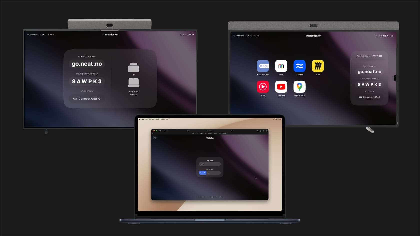 - BYOD – evolved. Connect your laptop with a USB-C cable and instantly tap into Neat’s premium microphones, cameras and speakers. Pair your browser with room controls and AI-powered notes, providing an easy way to adjust settings, manage the call, and capture key takeaways directly from your laptop.